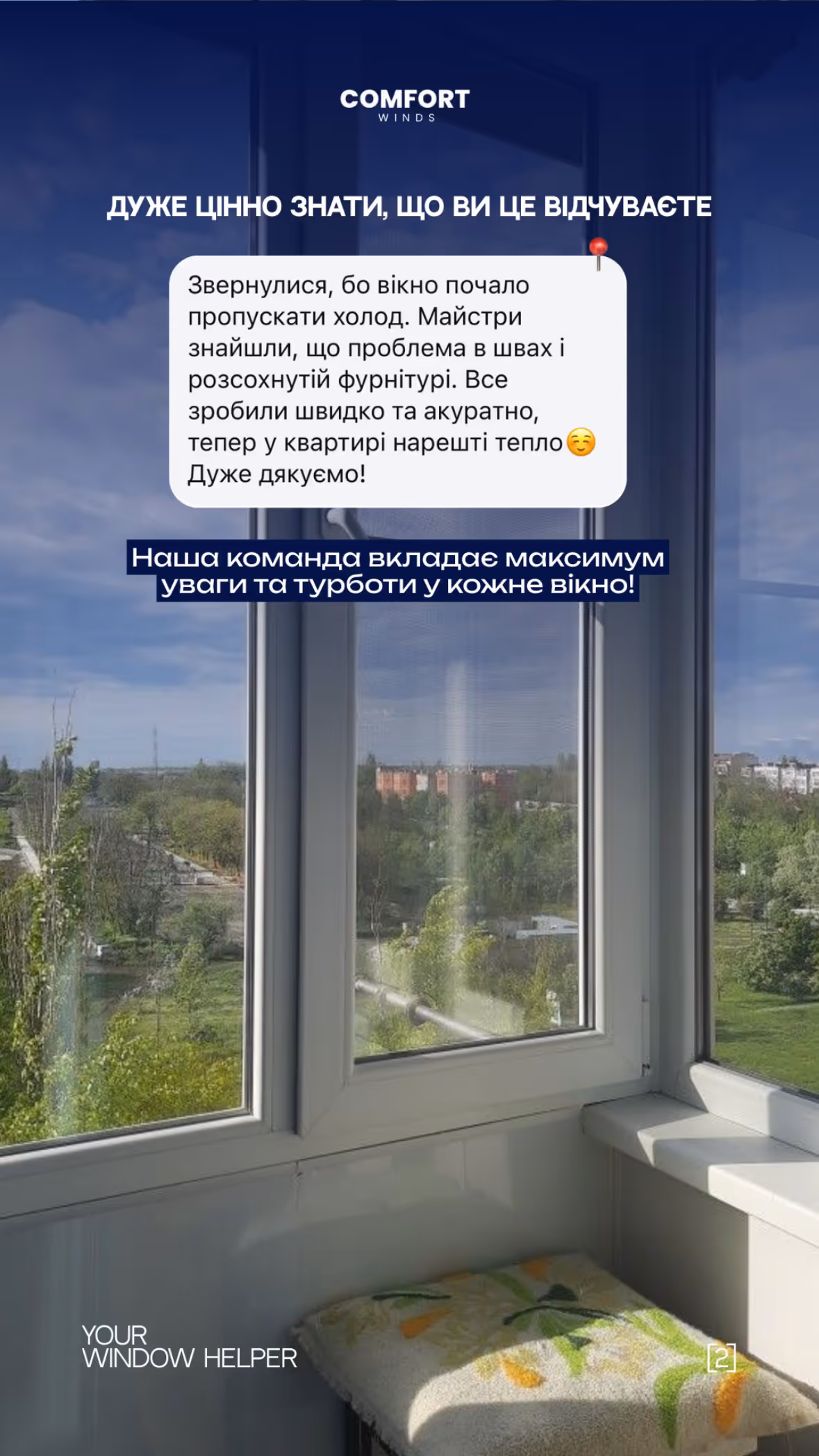 Наш майстер зв’яжеться з вами протягом 30 хвилин, щоб домовитись про зручний час виїзду. Дізнайтесь в якому стані ваші вікна та як їх покращити.